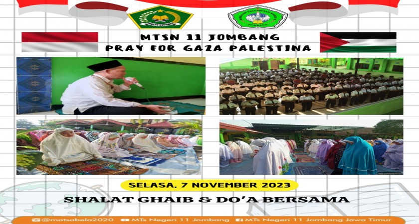 Bareng - mtsn11jombang.sch.id - Selasa (7/11) seluruh warga Madrasah Tsanawiyah Negeri 11 Jombang (MTsN 11 Jombang) yang terdiri dari siswa, guru, dan staf menggelar shalat ghaib dan doa bersama bagi rakyat Palestina yang menjadi korban agresi Israel. Hal ini sesuai dengan arahan menteri agama (Menag) Yaqut Cholil Qoumas yang mengajak seluruh umat islam melaksanakan shalat ghaib dan doa bersama.