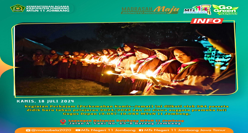Perkemahan Kamis-Jumat ini dilaksanakan selama 2 hari 1 malam, mulai pada Kamis siang (18/7) check in peserta pukul 13.00 WIB sampai dengan Jumat pagi (19/7) upacara penutupan pukul 06.30 WIB di lingkungan madrasah. Kegiatan ini diikuti oleh 284 peserta didik baru tahun pelajaran 2024/2025 dan 50 peserta baik putra maupun putri yang tak lain adalah anggota pramuka inti MTsN 11 Jombang Gugus Depan 19.087-19.088.